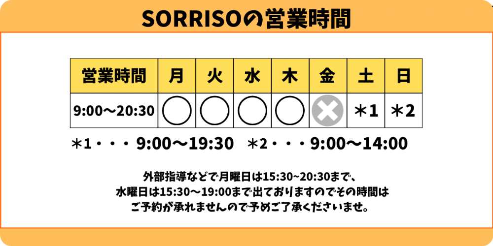 営業時間 | 平日 9:00~20:30 土 9:00~19:30 祝日 9:00〜18:00 定休日 日曜日 *出張や外部研修にともない、急遽休みにさせていただく場合がございます。あらかじめご了承下さい。 |