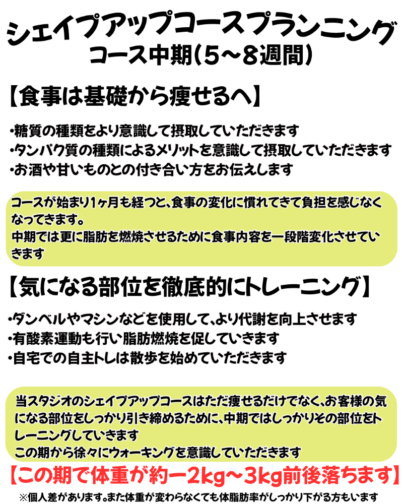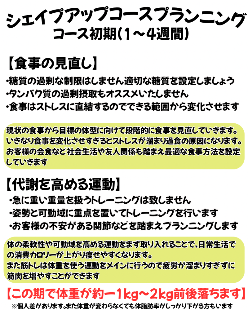 自分のシェイプアップ(トレーニング)のやり方に不安を覚えている方、早く身体を引き締めたい方にオススメのコースです。